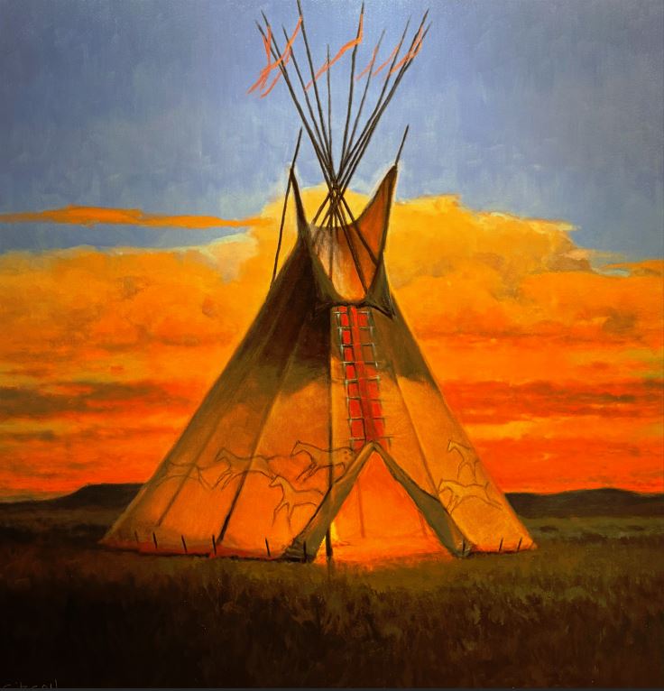 Gibson’s studies in architecture have had a direct influence on the path of his work. His teepees are themselves an architectural form. He critically analyzes his own paintings from an architectural perspective, focusing on creating a strong sense of composition with harmonious perspective and horizon line.